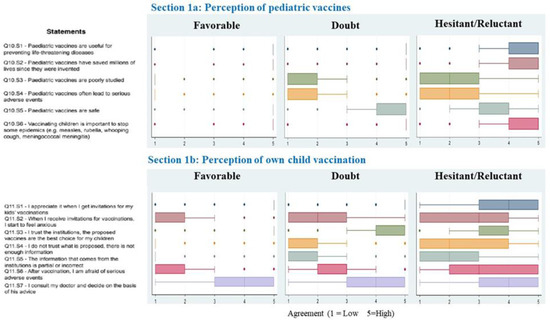 Figure 1 shows the concordance scores, expressed via boxplot (median and interquartile range), to the statements proposed in Q10. Overall, Favorable and Doubtful parents declared a higher level of confidence in the safety and efficacy of pediatric vaccines than Hesitant/Reluctant parents; this was investigated through statements Q10.S1 and Q10.S5 (all p-values < 0.001).