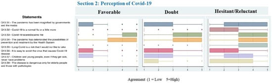 Figure 2 shows the scores of the statements on the risk perception of COVID-19. Risk perception of COVID-19 differed between groups; Hesitant/Reluctant parents reported a higher level of complacency in themselves and their children than the Favorable and Doubtful groups. In particular, the median score for the statement Q13.S7 was 1 (IQR 1; 2) for the Favorable group, 2 (IQR 1; 3) for the Doubtful group and 3 (IQR 2; 4) for the Hesitant/Reluctant group (Kruskal–Wallis test p < 0.001). The perceived ease of avoiding COVID-19 was significantly lower in the Favorable group (Median score: 1, IQR: 1; 1) (Kruskal–Wallis test p < 0.001).