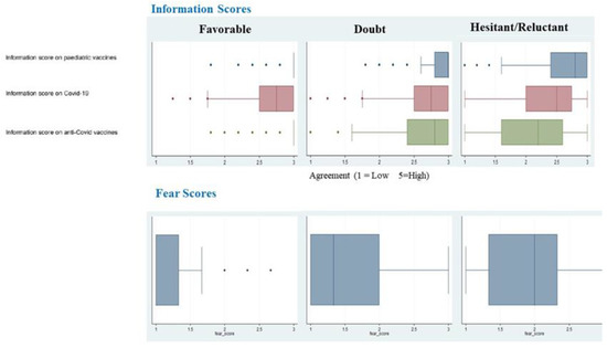 Figure 4 shows the information scores and fear scores. Hesitant/Reluctant parents showed lower median scores than Doubtful and Favorable parents with regard to pediatric vaccines: 2.2 (IQR 1.6; 2.6), 2.8 (IQR: 2.4; 3.0) and 3 (IQR: 3.0; 3.0), respectively, with p < 0.001. For fear scores on COVID-19, the scores were 2 (IQR 1.3; 2.3) for Hesitant/Reluctant, 1.3 (IQR: 1; 2) for Doubtful and 1 (IQR: 1.0; 1.3) for Favorable, with p < 0.001.