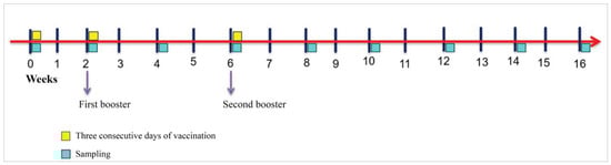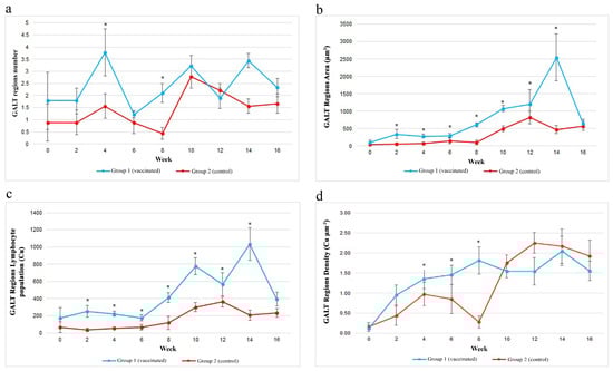 Later, the numbers of GALT regions in both groups started to decrease before increased again in week 10. However, the number of GALT regions of the vaccinated group was significantly (p < 0.05) higher in week 8. Starting from week 14 onwards, the trend between the two groups were not similar (Figure 7a). It was observed that the mean number of GALT regions in the vaccinated group increased following administration of boosters at weeks 2 and 6.