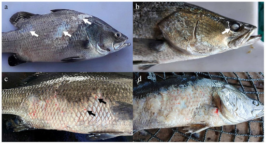 Gross lesions in Asian seabass observed throughout the 16-week vaccination trial. (a) Areas of scale loss (arrows), which was observed on week 2. (b) Ocular opacity (arrow) was observed on week 6. (c) Extensive loss of scale was observed on week 8. Note the reddish discoloration (arrows) due to ulceration. (d) Extensive loss of scale, ulceration, and fin erosion, accompanied by severe ocular opacity in week 10.