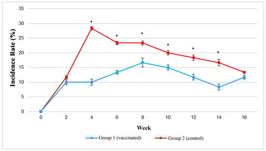 In week 0 both vaccinated and control groups had no incidence rate of vibriosis, while in week 2, the incidence rates of vibriosis in both groups were about 10%, showing no significant (p > 0.05) difference between the two groups. Thereafter, the incidence rates of vibriosis in the control group spiked and reached its highest at (28.3 ± 2.7), and remained significantly (p < 0.05) higher compared to the vaccinated group until week 14. On the contrary, the incidence rates of vibriosis in the vaccinated group remained lower than those of the control group from week 4 until week 14, ranging between (10–17%). In week 16, the incidence rates of vibriosis in the two groups were not significantly (p > 0.05) different (Figure 3).