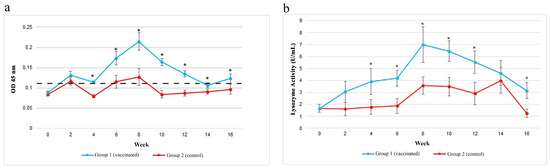 The lysozyme activity in the gut lavage at week 0 for both groups was similar. Then, the vaccinated group showed higher lysozyme activity in week 2. Between weeks 4 and 6, the vaccinated Group 1 showed significantly (p < 0.05) higher lysozyme activity than the control Group 2 and continued to increase significant (p < 0.05) and rapidly in week 8 following the second booster. From week 8 onwards, the lysozyme activity of the vaccinated Group 1 started to decline but remained significantly (p < 0.05) higher in weeks 10 and 16 than the control Group 2. The highest lysozyme activity was in week 8 and lowest was in week 0. The control group showed similar trend with slow increased between weeks 2 and 6. This was followed by a rapid increase in week 8, a slight decreased in week 10, increased back in week 14 and continued to decline in week 16. The highest lysozyme activity of the control group was in week 8 and lowest in week 0 (Figure 4b).