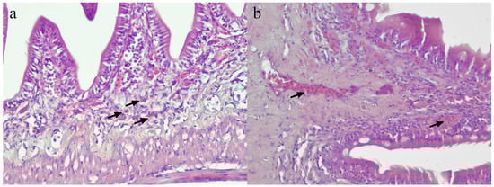 Histopathology of the gut of vaccinated and control Asian seabass. (a) Mild inflammation involving eosinophilic granular cell (arrows) infiltrates in the gut mucosa. (b) Mild congestion of blood vessels (arrows) in the lamina propria and muscularis layer.