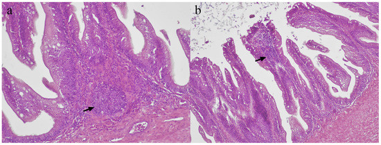 GALTs were observed in the guts of both groups. They were observed either at the base of villi in the lamina propria, or within the villi, also known as lymphocyte-filled villi (Figure 6a,b). Majority of the GALT regions showed scattered pattern instead of a clear aggregation. The mean number of GALT regions of both groups was similar throughout the study period, which was generally low, ranging between 1 and 4. The number of GALT regions of both groups were constant in the first two weeks of the study. At week 4, a slight increase was observed in the control group, while the vaccinated group showed significant (p < 0.05) and abrupt increase in the number of GALT regions.