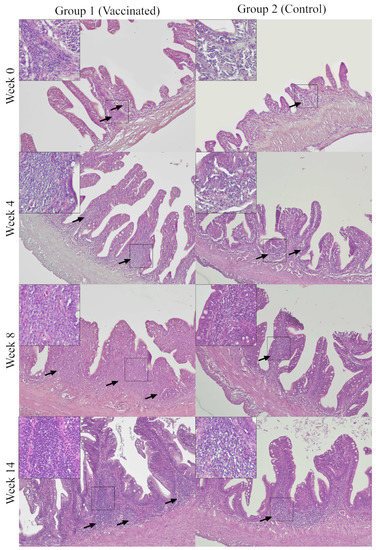 Representative micrographs of GALT regions (arrows) of the vaccinated and control Asian seabass. Insets are higher magnification for the GALT regions. GALT regions are small in both groups at week 0. GALT regions are generally larger and denser in the vaccinated Group 1 compared to the control Group 2 at week 4, 8, and 14.