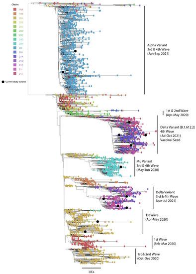 Phylogenetic analysis of circulating SARS-CoV-2 virus strains in Pakistan (black balls) during the 1st–4th wave.