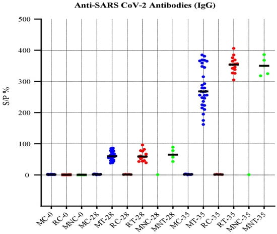 No adverse effects or clinical signs were observed during the experimentation in all the animal models (mice, rabbits, and rhesus macaques). The collected serum samples were processed for determination of presence of anti-SARS-CoV-2 immunoglobulin (IgG) antibodies. The results revealed that the inactivated SARS-CoV-2 vaccine developed in this study produced detectable IgG antibodies after three weeks. There was an increased level of antibodies IgG after 35 days of vaccination in all three animal models. The serum samples collected from all animals of the negative control group had no anti-SARS-CoV-2 IgG antibody, as shown in Figure 3.
