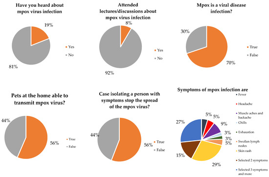 The results of the knowledge assessment questionnaire revealed participants’ knowledge gaps concerning MPXV infections, i.e., they had a moderate level of knowledge about mpox. Put another way, the respondents were not quite informed about the disease, its symptoms, causes, transmission, and treatment, as well as about how to handle people with the disease. The reason why people have this relatively limited amount of information regarding the disease can be associated with the fact that the disease has not yet been reported widely in the Middle East. Additionally, the participants did not have experience with the disease, and their knowledge was limited as knowledge of something that could partly stem from experience []. Based on previous research [], the disease is a re-emerging disease in the world. Although the outbreak seems recent, knowledge of the disease by ordinary people can help prevent its development. Our results coincide with previous research not only among ordinary people, but among Jordanian medical, nursing, dentistry, and pharmacy students [], Indonesian general practitioners [], Saudi physicians with medical students [], health professionals in Kuwait [], and Italian physicians []. These groups of the human population are considered knowledgeable as they belong to the health sciences and should possess information at least regarding health-related topics. This highlights the recency of the disease, not in terms of its origin, but rather in terms of its reappearance. A dearth of knowledge concerning the transmission, treatment, and symptoms can negatively affect the control of the disease. Therefore, raising the population’s level of knowledge and awareness is suggested to successfully prevent the disease from spreading across the world.