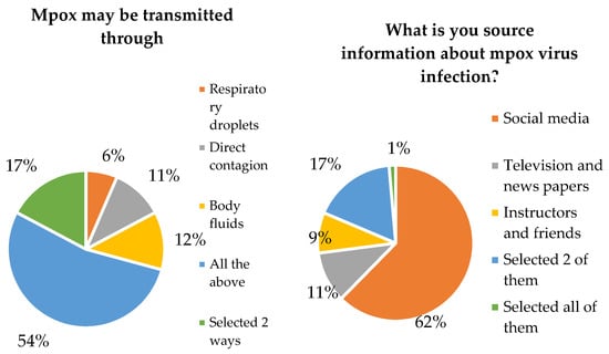 Our data suggested that 70% of participants believed that mpox is a viral infectious disease; 81% never heard of mpox, 92% never attended a lecture or discussion about mpox, and 56% believed that isolating people with symptoms of the disease will stop the spread of the epidemic (Figure 1). Furthermore, 54% of participants believed that the virus would be transmitted in more than one way, 26.7% of the participants chose more than one item as a symptom of the disease, and 62.2% selected social media as a source of their knowledge of the disease (Figure 1).