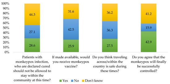 The second principal variable of this study involved participants’ attitudes towards mpox, particularly towards vaccination, control of the disease, and travel related safety issues within the country. The results showed that the participants held neutral attitudes towards mpox. Although mpox has not spread among people, the attitudes were not reported to be positive. The rather low attitude of the participants indicates the adverse and preconceived effects of COVID-19 on this portion of the population. As Yoo states, “The wounds that the COVID-19 pandemic has inflicted on us are very deep and seemingly long-lasting and still affect us” []. Such attitudes revealed in this study contradict previous research [,], reporting positive attitudes because, unlike the participants of our study, these studies were conducted among physicians. Importantly, the limited knowledge of these study participants might be one reason behind the neutral attitudes expressed.
