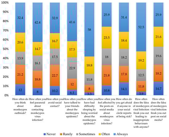 The worry level of participants about the current mpox outbreak is presented in (Figure 3). In the preceding two weeks, over half of the participants had been preoccupied by the mpox outbreak, ranging from sometimes to always. The fear of contracting the MPXV caused paranoia in 43% of the respondents, and 41% admitted to feeling terrified when a friend or a family member became sick, ranging from sometimes to always. However, 11% of the participants reported having difficulty in sleeping in the past two weeks owing to worry about the current outbreak. The frequency of these difficulties ranged from often to always. Furthermore, 50% of the respondents had restricted social connections, and 42% never discussed the outbreak with their friends. Approximately 16% of participants were engaged in inappropriate social behavior due to their fear of contracting the virus. The frequency of these behaviors ranged from often to always. Almost 26% of participants never posted anything on social media about the mpox outbreak.