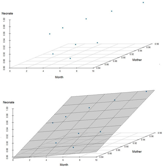In our study, we saw that the existing relationship between maternal antibodies and neonate antibodies is high, and we observed that the values are visually very similar, which is numerically confirmed through the Pearson’s correlation coefficient between the two variables, corresponding to 0.95; thus, as the mean maternal antibodies grow, the mean neonate antibodies also tend to grow, and furthermore, maternal antibodies account for about 95% of the variation in neonate antibodies.