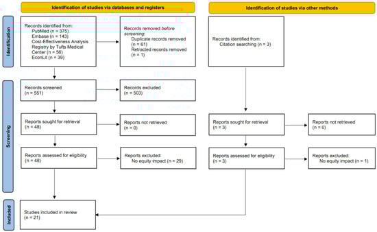 The Immunization Agenda 2030, through its Strategic Priority 3, addresses equity by defining key areas of focus and objectives to reach the goal of protecting everyone with full immunization, regardless of location, age, socioeconomic status, or gender-related barriers []. The World Health Organization’s “Guide for Standardization of Economic Evaluations of Immunization Programmes” also recommends that the health equity impact be included if it is considered an important factor for decision-making []. These recommendations emphasized the need to explore and summarize how health equity was incorporated and evaluated in the existing literature on economic evaluations of vaccines.