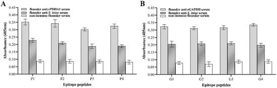 Reactions of the synthetic B-cell epitope peptides of PDHA1 and GAPDH to flounder serum by ELISA. (A) PDHA1 antigen epitope polypeptide and anti-PDHA1/anti-S. iniae serum; (B) GAPDH epitope polypeptide and anti-GAPDH/anti-S. iniae serum. Non-immune flounder serum was used as a negative control.