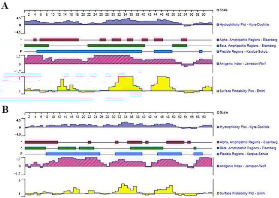 Prediction of hydrophilicity, antigenicity and surface probability of multi-epitope tandem. (A) MEPIP; (B) MEPIG.