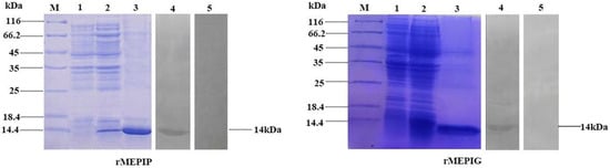 The optimized connection order of these mimotopes were confirmed to be P1-KK-P2-KK-P3-KK-P4 and G1-KK-G2-KK-G3-KK-G4, in which each epitope maintained its independence and antigenicity as analyzed by the Lasergene’s Protean program (Figure 3). SDS-PAGE analysis indicated that both the purified rMEPIP and rMEPIG showed a single band at 14 kDa, which was consistent with their theoretical molecular weight, suggesting that the recombinant proteins were efficiently purified. Western blot analysis indicated that the purified rMEPIP and rMEPIG proteins could be labeled well by flounder anti-S. iniae serum (Figure 4).