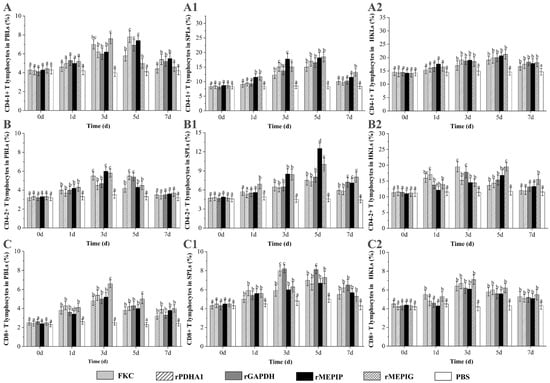 Variations of CD4-1+, CD4-2+ and CD8+ T lymphocyte percentages in PBLs, SPLs and HKLs of flounder after FKC, rPDHA1, rGAPDH, rMEPIP, rMEPIG and PBS immunization. (A,A1,A2): Variations of CD4-1+ T lymphocyte percentages in PBLs/SPLs/HKLs of flounder after immunization; (B,B1,B2): Variations of CD4-2+ T lymphocytes percentages in PBLs/SPLs/HKLs of flounder after immunization; (C,C1,C2): Variations of CD8β+ T lymphocytes percentages in PBLs/SPLs/HKLs of flounder after immunization. Values are shown as means ± SD of three fish. Different letters above the bar represent the statistical significance (p < 0.05) compared to each other at the same time point.
