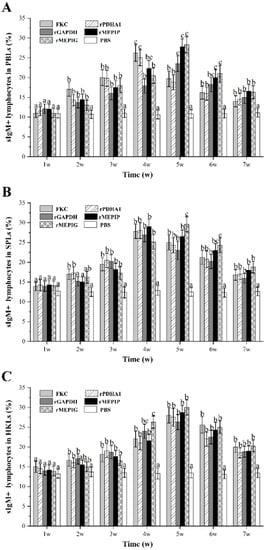 The gated lymphocytes in the FSC/SSC dot plot and representative fluorescence histograms at peak level after immunization are shown in Figure S2, and changes in percentages of sIgM+ B lymphocytes in different tissues of vaccinated fish are summarized in Figure 6. The levels of sIgM+ lymphocytes in PBLs induced in all groups began to rise from week 2 and were higher than those in the PBS group, peaked at week 4 or 5, and then began to decline. The percentage of sIgM+ lymphocytes in PBLs reached a peak at week 4 in the FKC and rPDHA1 groups (26.2% and 25.0%), and at week 5 in the rGAPDH, rMEPIP and rMEPIG groups (23.5%, 27.8% and 28.3%) (Figure 6A). The percentage of sIgM+ lymphocytes in SPLs began to rise at week 2 and reached a peak at week 4 in the FKC (27.8%) and rPDHA1 (28.0%) groups, which significantly increased at week 2 and peaked at week 5 in the rMEPIG group (29.6%) (p < 0.05). Moreover, the percentages of sIgM+ lymphocytes in SPLs induced by rGAPDH and rMEPIP reached a peak value at week 4, which were 26.9% and 29.0% (Figure 6B). In HKLs, the percentage of sIgM+ lymphocytes induced by FKC, rPDHA1, rGAPDH, rMEPIP, and rMEPIG groups all began to rise at week 2 and peaked at week 5, with peak levels of 28.0%, 27.5%, 26.3%, 28.7% and 30%, respectively (Figure 6C).