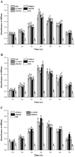 Furthermore, the level of specific IgM against recombinant proteins rPDHA1 and rGAPDH in all immunized groups was significantly higher than that of the PBS group from week 2 (p < 0.05) (Figure 7C), showing a trend of increase first and then decrease. In the rGAPDH group, it peaked at week 5 and then decreased slowly. In the rMEPIP, rMEPIG, and rPDHA1 groups, the level of anti-rPDHA1/rGAPDH-specific IgM peaked at week 4, with a higher level in the rMEPIP group.