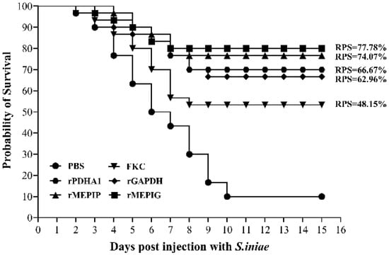 After S. iniae challenge, the infected fish showed typical signs of streptococcicosis, and the microbiological assay confirmed that S. iniae was the only bacterial pathogen re-isolated from the moribund fish (not shown). The accumulative mortality rate in the FKC, rGAPDH, rPDHA1, rMEPIP, rMEPIG, and PBS groups was 46.67%, 33.33%, 30%, 23.33%, 20% and 90%, corresponding to the calculated RPS of 48.15%, 62.96%, 66.67%, 74.07% and 77.78%, respectively (Figure 8). In addition, a significant analysis of mortality in each group by the Log Rank method revealed that mortality in the FKC, rGAPDH, rPDHA1, rMEPIP and rMEPIG groups was significantly different from that in the PBS group (p < 0.05) (Table 2).