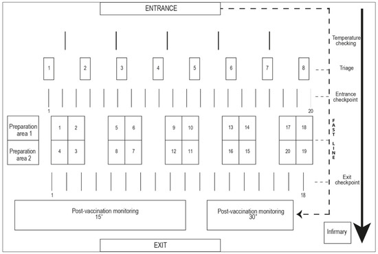 - The medical coordinator was an emergency physician or an anesthesiologist trained in disaster medicine. He/she was involved in the medical triage and management of post-vaccination adverse events during the surveillance period. He/she ensured the proper functioning of the vaccination process, checked the number of vaccination lanes, and participated in the briefing and debriefing of the teams;