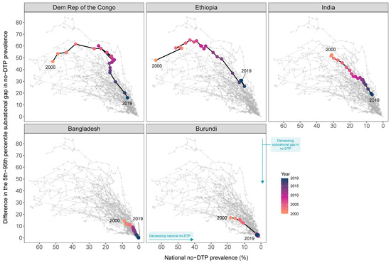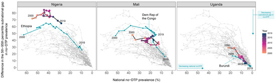 There is ample opportunity—and need—to characterize what drives successful vaccine delivery and uptake across the spectrum of past and current challenges, particularly around vaccination inequalities. One key consideration that emerged from this analysis involves the pathways by which no-DTP changed both nationally and sub-nationally from 2000 to 2019. Particularly among countries that started with higher levels of no-DTP (e.g., Nigeria and Mali; Ethiopia, and the DRC), subnational gaps often remained unchanged or increased while national no-DTP prevalence began improving. Such pathways suggest that explicit equity program targets and implementation practices may not occur until later. Other countries, including India and Bangladesh, had more consistent declines for both metrics from 2000 to 2019—a potential signal into the ways in which countries are concurrently addressing both national vaccination priorities and at least geographic inequalities. Nonetheless, it is also possible that countries such as India and Bangladesh experienced similar pathways of minimal changes in or rising subnational inequality amid decreasing national no-DTP prior to 2000. Developing a more formalized characterization or framework around ‘pathways of progress’ toward greater vaccination equity should be considered in future studies, both by geography and across other crucial factors (e.g., gender, wealth, education, religion, ethnicity).