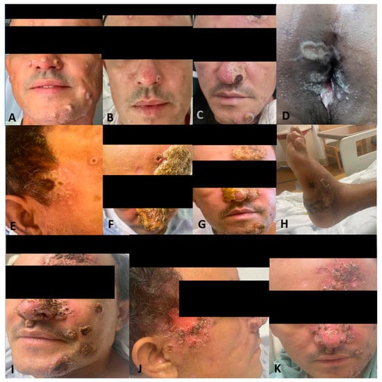 Patient presenting with monkeypox dermatological lesions: (A) Initial presentation without any previous treatment. (B) Improvement after treatment with tecovirimat. (C) Worsening of his monkeypox with hemorrhagic lesions with crusting in the center and whitish discoloration around them after 15 days of ART initiation. (D) White-yellow rounded punched-out erosions on the perianal region with elevated borders and surrounding purulent material. (E) Temporal lesion. (F,G) Worsening nasal lesions 42 days after ART initiation. (H) Abscess in the left ankle. (I) Face lesions after 1st Cidofovir dose. (J) Progression of the temporal lesion. (K) Lesions improving and crusted, close to discharge.