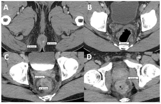 Comparison of two computerized tomographies of the pelvis with contrast. (A,B) were taken when the patient was already diagnosed with monkeypox but had not taken any medication and showed a rim-enhancing perirectal abscess measuring up to 2.5 cm in AP dimension (A) with a perirectal lymph node measuring up to 12 mm in short axis dimension (B–D) were taken when the patient came back after antiretroviral treatment with worsening of proctitis-related symptoms and showed three persistent vs. new rim-enhancing perirectal abscess.