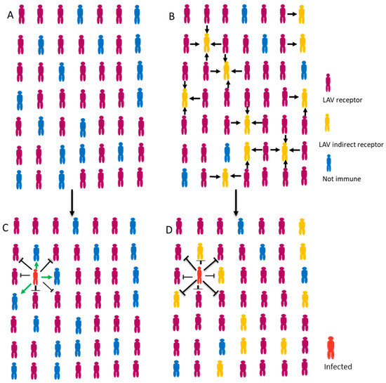 Schematic representation of the HI achieved with the non-proliferative vaccine application (A) compared with the hypothetical HI achieved with LAV application (B). Non-proliferative vaccines induce immunity in individuals who receive them; LAV vaccines induce immunity in individuals who receive them, as well as those contacts in whom the attenuated virus spreads, increasing the % of the immune population. The spread of the pathogenic SARS-CoV-2 in a population with 60–70% immune individuals is still possible (C), but it would be more difficult or would no longer occur in a population with a higher of immune individuals (D).