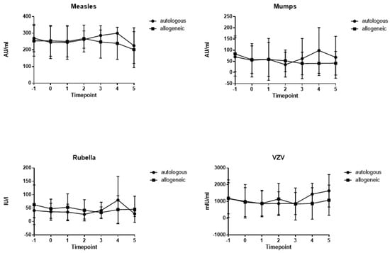 At baseline, before HSCT, most patients showed antibodies against measles (n = 40, 100%), mumps (n = 32, 80%), rubella (n = 39, 97.5%) and varicella (n = 37, 92.5%). The majority of patients retained antibodies against measles (n = 37/40, 92.5%, allogeneic: n = 25/28, autologous: n = 12/12), mumps (n = 25/40, 62.5%, allogeneic: n = 15/28, autologous: n = 10/12), rubella (n = 35/40, 87.5%, allogeneic: n = 24/28, autologous: n = 11/12) and varicella (n = 34/40, 85%, allogeneic: n = 23/28, autologous: n = 11/12) up to 12 months after HSCT. The time courses of mean antibody titers against measles, mumps, rubella and varicella from T – 1 to T + 5 are shown in Figure 1. Measles titers in allogeneic HSCT recipients declined from 254.1 (±92.2.0) AU/mL at T – 1 to 201.5 (±107.9) AU/mL at T5, but this decline did not reach statistical significance (p = 0.476). Mumps titers (83.5 (±80.3) AU/mL at T – 1 to 41.7 (±53.1) AU/mL at T5; p = 0.219), rubella titers (62.7 (±74.0) IU/mL at T – 1 to 45.8 (±48.8) IU/mL at T5; p = 0.378) and varicella titers (1191.1 (±930.3) mIU/mL at T – 1 to 1074.5 (±902.3) mIU/mL at T5; p = 0.789) also did not decline significantly over 12 months after HSCT. Antibody titers did not differ significantly between patients after allogeneic and autologous HSCT. At all seven time points, absolute lymphocyte counts were assessed and did not differ significantly between the allogeneic and autologous groups (Supplementary Figure S1).
