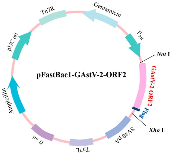 Schematic diagram of pFastBac1 vector construction. The GAstV-2 ORF2 gen and Flag-tag were inserted into the multiple cloning sites between the Not I and Xho I restriction sites downstream of the PPH of the pFastBac1 vector.