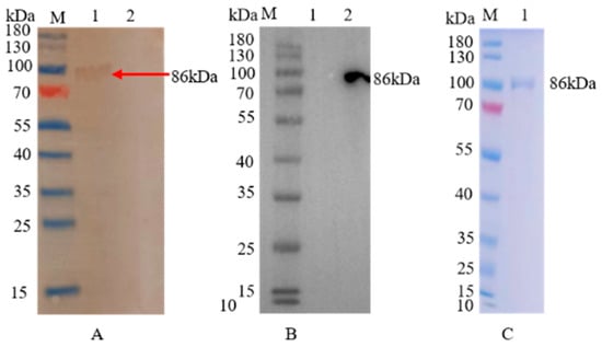 Following digestion, ligation and sequencing, the rBacmid-ORF2 was transfected into Sf9 cells to rescue rBV-ORF2. Western blotting results showed that a target band of 86 kDa was found, but no band could be detected for the empty vector, indicating that the rCap was successfully expressed and the expressed band had a superior immunoreaction with mouse anti-ORF2 polyclonal antibodies and mouse anti-flag monoclonal antibodies (Figure 2A,B). Anti-flag affinity gel was applied to purify the Flag-tagged rBV-ORF2, and a single band was detected by SDS-PAGE (Figure 2C), and the purity is 97%. The concentration of rCap estimated using a BCA protein quantification kit (Vazyme, Nanjing, China) was 0.27 mg/mL.