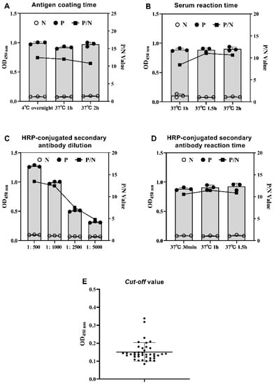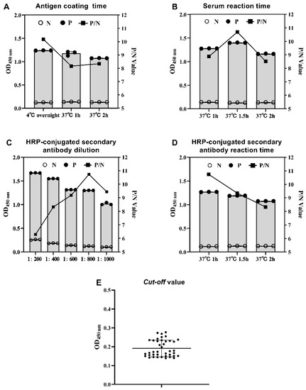 Optimization of GAstV-2-Cap-ELISA reaction conditions. (A) Optimization of protein coating conditions. ELISA plates with 125 ng/well coating protein were incubated at 4 °C overnight, 37 °C for 1 h, and 37 °C for 2 h. (B) Optimization of reaction time of sera. The sera with dilutions of 1:200 were reacted at 37 °C for 1 h, 1.5 h, and 2 h. (C) Optimization of dilution of HRP-conjugated secondary antibody. The dilution of the HRP-conjugated secondary antibody was 1:500, 1:1000, 1:2500, and 1:5000. (D) Optimization of reaction time of HRP-conjugated secondary antibody. The HRP-conjugated secondary antibody was reacted at 37 °C for 30 min, 1 h, and 1.5 h. (E) The determination of GAstV-2-Cap-ELISA cut-off value. Forty negative sera were used to calculate the cut-off value of GAstV-2-Cap-ELISA.