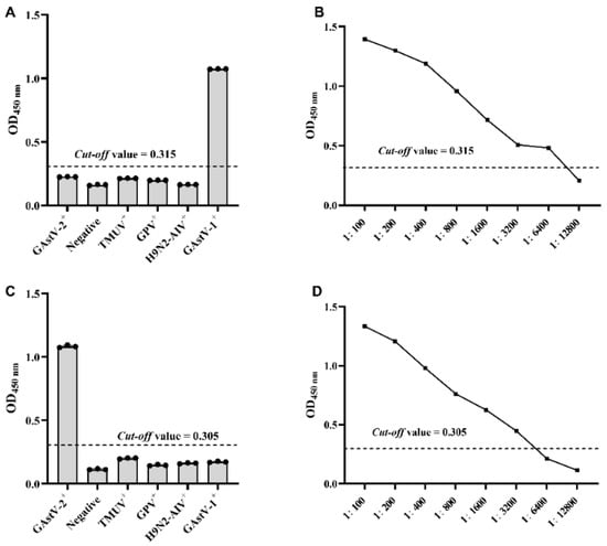 The sensitivity of GAstV-1-ELISA and GAstV-2-Cap-ELISA were determined using three corresponding positive sera, serially diluted two-fold from 1:100 to 1:12,800. The results showed that the minimum detection limit of GAstV-1-ELISA and GAstV-2-Cap-ELISA were 1:6400 and 1:3200, respectively (Figure 5B,D).