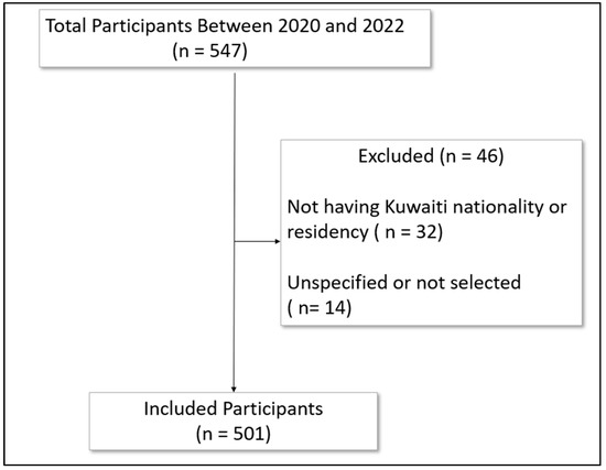 During the study period, 547 participants consented to participate in the survey; 501 met the inclusion criteria and were included in the current study (Figure 1).