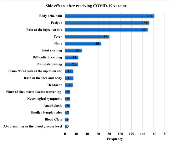 In the study of Guar et al. [28], the common reasons for vaccine hesitancy were “not yet decided”, fear related to vaccine side effects, and fear of the disease worsening. Concerns about the recurrence of flares and adverse consequences were two of the most common causes of hesitancy in previous studies in the literature [28,33,34]. In our study, fear that the vaccination will aggravate the condition or interfere with the current therapy, concerns about its effectiveness, as well as its side effects were the most prevalent causes for refusing to accept the SARS-CoV-2 vaccine. Other patients were worried about the paucity of the data because individuals with IRD had been omitted from earlier research, resulting in a dearth of information. Such findings should be considered, requiring public education to clear up this uncertainty. Our data showed that the most commonly reported post-vaccination side effects were body ache/pain (32.1%), fatigue (n = 30.3%), and pain at the injection site (29.7%). No serious or life-threatening side effects were self-reported. The study findings highlight that SARS-CoV-2 vaccines have an acceptable safety profile, with the majority of side effects being temporary and mild, which is consistent with previous studies [9,14,35,36]. These results are similar to a cross-sectional analysis of adverse reactions to six SARS-CoV-2 vaccinations in 225 individuals with IRD, which showed that localized pain was the most common adverse event (70.2%). The most prevalent systemic symptoms were fatigue (34.7%), headache (30.6%), and muscular pain (29.3%). No significant adverse events requiring hospitalization or medical treatment were recorded [36]. A recent meta-analysis showed that, except for a higher prevalence of arthralgia, adverse events caused by SARS-CoV-2 vaccinations were comparable in IRD patients to those in healthy controls. The authors concluded that complete immunization is essential in IRD patients. Furthermore, the immunizations were documented to be generally safe [4].