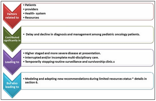 In pediatric patients, new oncologic diagnoses require efforts made by a multidisciplinary team for appropriate evaluation and care. Workup typically includes imaging, biopsy, placement of central lines, initiating treatment, and referring to a center that specializes in this care. However, this may not always be the case, especially in countries around the world that do not have access to these resources of care. With the COVID-19 pandemic, there was an inability to obtain these resources or receive the appropriate quality of care and treatment globally but especially noted in resource-poor areas []. Reports in India suggested that with the COVID-19 pandemic and lockdown restrictions, there was a noted 50% decrease in new cancer cases being diagnosed. It was thought to be due to restrictions on travel implemented during the pandemic with limited access to seek medical care [,,,]. Hence, numerous patient-, provider-, and health-related factors have contributed significantly to the delay and decline in diagnosis among pediatric oncology patients during the COVID-19 pandemic. (Figure 1).