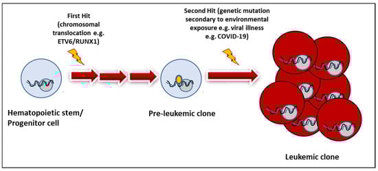 Children with malignancies constitute one of the most vulnerable subsets of the pediatric population. When COVID-19 first emerged, it stirred an interest among oncologic societies across the globe to study the impact this novel virus could have on various pediatric cancers. Dr. Greaves proposed the two-hit hypothesis for pediatric leukemogenesis. The first hit occurs prenatally with a noted preleukemic clone that may have a leukemia-associated genetic change, such as ETV6-RUNX fusion translocation. The second hit is exposure to an infectious agent in an already genetically susceptible child with preleukemic cells that may lead to an overstimulated immune response and allow for the proliferation of the leukemic cells [,,]. Daycare attendance through the first 12 months of life has been shown to have a protective effect on ALL, as studied by the U.K. Children’s Cancer Study Group in the 1990s []. Further, consideration can be made that the closure of daycare centers and schools during the pandemic, as well as limited social interactions from the lockdown, may have caused the lack of immunological training for the patients []. This would describe the “second hit” in that these children had minimal infectious exposures throughout the first few years of their lives. However, once they became infected with a pathogen, their immune systems may have developed a heightened reaction that may have induced the development of leukemia [,]. (Figure 2).