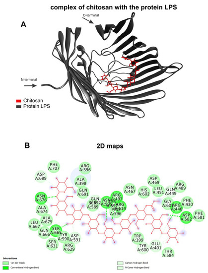 The selected templates for homology modeling are shown, highlighting the identities and the validation results with the corresponding Ramachandran favored values and QMEAN. (Table 1). The chitosan complexed with the receptor and formed various interactions with varying affinity energies, as indicated by the docking assays (Table 2). The chitosan ligand showed better affinity energy with target Acinetobacter baumannii at −8.4 kcal/mol. The complex formed between the chitosan ligand and the LPS target receptor of the organism Acinetobacter baumannii presents a strong interaction with the receptor’s amino acids (Figure 3A). This complex showed interactions between the target and ligand of the type: van der Waals, conventional hydrogen bond, carbon–hydrogen bond and pi-donor hydrogen bond (Figure 3B).