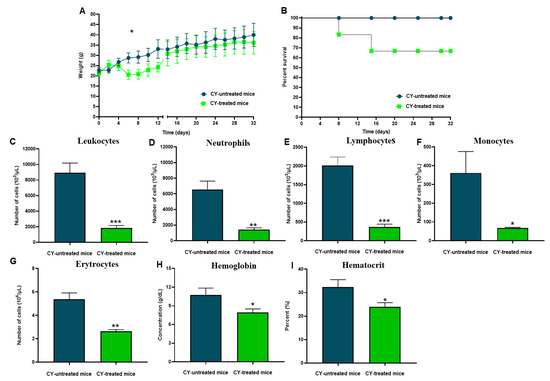 Description of the immunosuppressive model Swiss mice. (A) Bodyweight monitoring of CY-treated and CY- untreated mice using six animals per group. Data are expressed as the mean and standard deviation, (*) p < 0.05. (B) Percentage survival of CY-treated mice using cyclophosphamide (150 mg/kg). (C) Leukocyte numbers. (***) p < 0.001. (D) The number of neutrophils. (**) p < 0.01. (E) Several lymphocytes. (***) p < 0.001. (F) The number of monocytes. (*) p < 0.05. (G) Several erythrocytes. (**) p < 0.01. (H) Hemoglobin. (*) p < 0.05. (I) Hematocrit. (*) p < 0.05. p values were determined by the t-test.