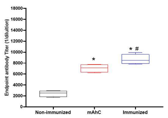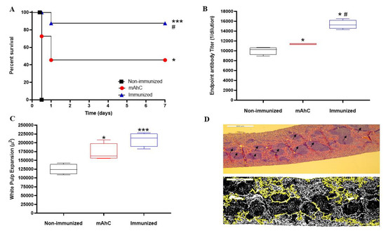 Statistical analysis was performed using the GraphPad Prism software GraphPad Software Inc. San Diego, CA, USA. The Kruskal–Wallis analysis of variance test was used to compare non-immunized, mAhC-treated, and immunized animals (regarding immunization efficiency). The following parameters were compared: the number of surviving animals according to the Kaplan–Meier survival curves was used with the log-rank test (Mantel–Cox test) and those with symptoms, white blood cell count, and IgG production. Histopathological damage and white pulp expansion were used to compare non-immunized versus adjuvant-treated and non-immunized versus immunized animals. The significance level was p < 0.05, and we included the 95% confidence interval. The Student’s t-test was used for comparisons of means of experimental parameters.