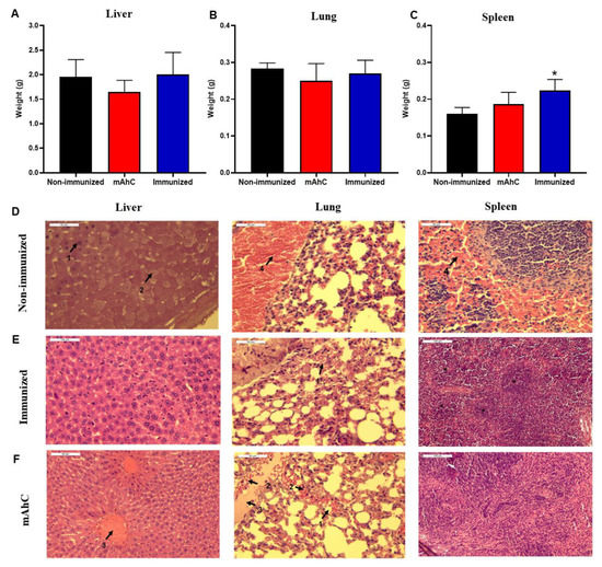The sepsis model of A. baumannii infection showed tissue damage in the liver, spleens, and lungs in CY-treated mice, the non-immunized mice, and the mAhC (Figure 7). By comparison, there were no significant differences between the liver and lung weights of these groups (Figure 7A,B). In terms of the weight of the spleens of immunized CY-treated mice, there were significant differences from the non-immunized CY-treated or adjuvant groups (p < 0.05) (Figure 7C). In addition, more substantial expansion of the white pulp was observed in this group (p < 0.01) and the adjuvant group (p < 0.05) (Figure 7D). The expansion of the white pulp is related to the presence of periarteriolar and follicular hyperplasia caused by the antigenic stimulus and immune response (Figure 6D and Figure 7D). The histopathological findings revealed greater severity in the liver with hydropic degeneration and decreased sinusoids, and interstitial pneumonia with a mixed inflammatory infiltrate and congestion (of minor severity in the mAhC and immunized groups) in the lung. Additionally, hemorrhage, congestion, and white pulp lymphoid hyperplasia were detected in the spleen (Figure 7D).