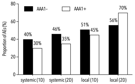 Proportions of local and systemic adverse events (AEs) in subjects with and without AAA1 positivity.