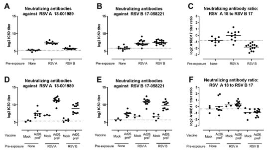 Ad26.RSV.preF induces RSV A and RSV B subtype-specific neutralizing antibodies in both RSV A and RSV B pre-exposed mice. Mice were pre-exposed to RSV A 18-001989 or RSV B 17-058221 12 weeks prior to immunization with 108 vp Ad26.RSV.preF (n = 12), or empty Ad26 vector (mock, n = 5). As controls, naïve mice were immunized with 109 vp Ad26.RSV.preF (n = 8), or empty Ad26 vector (mock, n = 3). Neutralizing antibodies titers against RSV A 18-001989 (A,D) or RSV B 17-058221 (B,E) were determined by MN VNA on serum isolated at week 12, prior to immunization (a,b), and at week 16, 4 weeks posts immunization (D,E). Log2 ratios between RSV A and RSV B VNT are depicted (C,F). The average responses in mock immunized naïve animals are indicated with dotted lines. Mean responses per group are indicated with horizontal lines. Note some data points are missing due to insufficient serum availability, dropout of animals from the study or experimental failure.