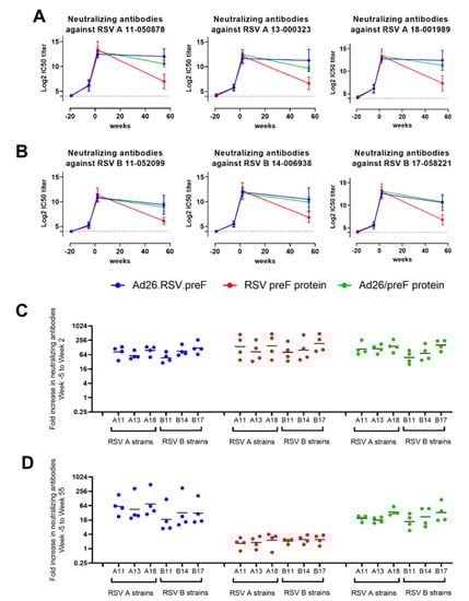 In addition, the increase in VNT per animal after immunization compared to pre-immunization titers was largely similar for the RSV A and RSV B strains tested (Figure 4C,D).