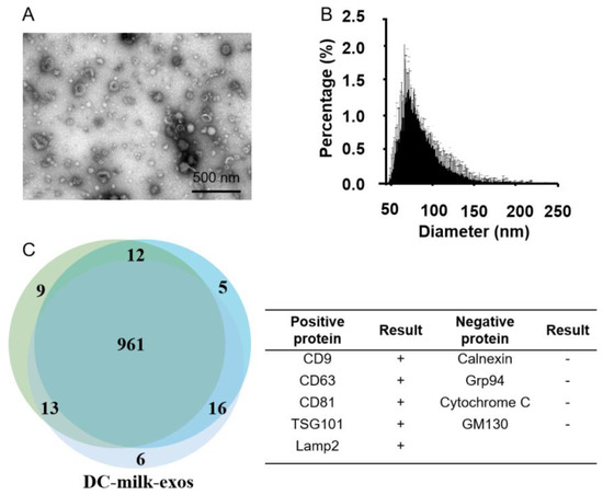 - Pieters, B.C.; Arntz, O.J.; Bennink, M.B.; Broeren, M.G.; van Caam, A.P.; Koenders, M.I.; van Lent, P.L.; van den Berg, W.B.; de Vries, M.; van der Kraan, P.M.; et al. Commercial cow milk contains physically stable extracellular vesicles expressing immunoregulatory TGF-beta. PLoS ONE 2015, 10, e0121123. [Google Scholar] [CrossRef]