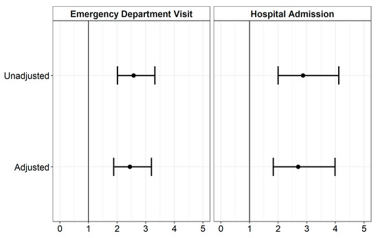 | Emergency Department Visit | 2.58 (2.01, 3.32) | 2.45 (1.88, 3.20) |