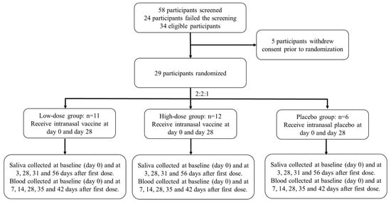 Participants between 18 and 55 years of age underwent a screening visit where a full medical history and physical examination were taken in addition to blood and urine tests. All participants were tested 4 days prior to the first and second vaccination and at each follow-up visit by deep throat saliva RT-PCR. Participants with positive SARS-CoV-2 RT-PCR would be excluded. Key exclusion criteria were known infection with SARS-CoV-2; any significant respiratory or cardiovascular disease; an immunocompromised condition or a history of autoimmune disease; history of severe allergic reaction to any vaccine or substance or hypersensitivity to eggs, egg proteins or gentamicin sulfate; any nasal abnormality that might affect vaccine administration; and positive result on serum antibody test for SARS-CoV-2 within 4 days prior to the first vaccination. Detailed inclusion and exclusion criteria could be found in the Supplementary File.
