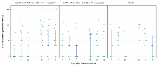 The immunogenicity endpoints included humoral, cellular, and mucosal immune responses post-vaccination. Cellular response induced by the DelNS1-nCoV-RBD LAIV vaccine was evaluated via INF-γ ELISpot. The serum T-cell response measured by IFN-γ ELISpot assay was higher in the high-dose group than the placebo group on day 14 (14 days after the first vaccination) [15 (0–31.3) vs. 0 (0–10) SFU/106 PBMC; p = 0.17] and day 42 (14 days after the second vaccination) [12.5 (5–52.5) vs. 5 (0–27.5) SFU/106 PBMC; p = 0.18], and also higher in the high-dose group than the low-dose group on day 14 [15 (0–31.3) vs. 0 (0–5) SFU/106 PBMC; p = 0.09] and day 42 [12.5 (5–52.5) vs. 0 (0–40) SFU/106 PBMC; p = 0.09], despite statistically not reaching significance (Table 3; Figure 4).